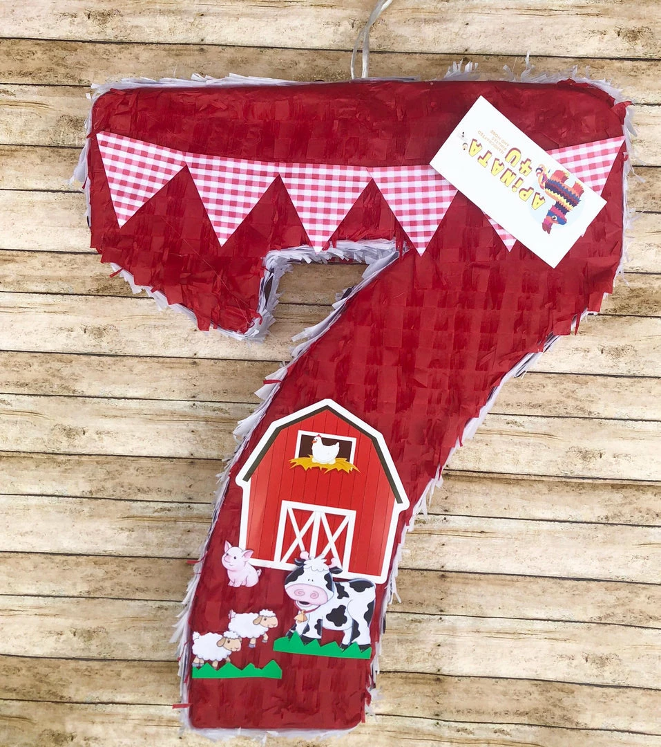 APINATA4U Barnyard Themed Number Seven Pinata Red Color For Second Birthday Farm Decoration Childrens